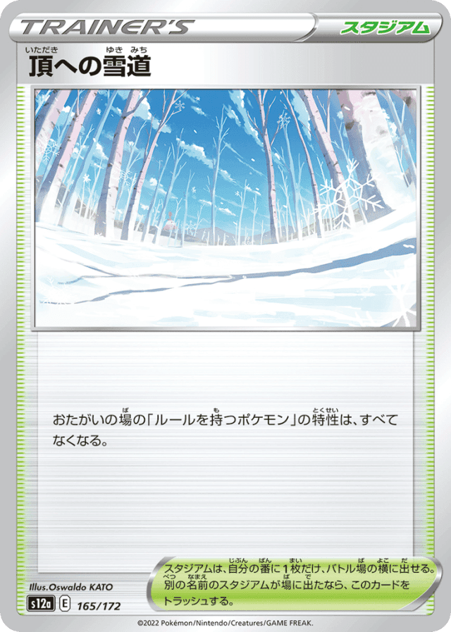 おたがいの場の「ルールを持つポケモン」の特性は、すべてなくなる。 スタジアムは、自分の番に1枚だけ、バトル場の横に出せる。別の名前のスタジアムが場に出たなら、このカードをトラッシュする。