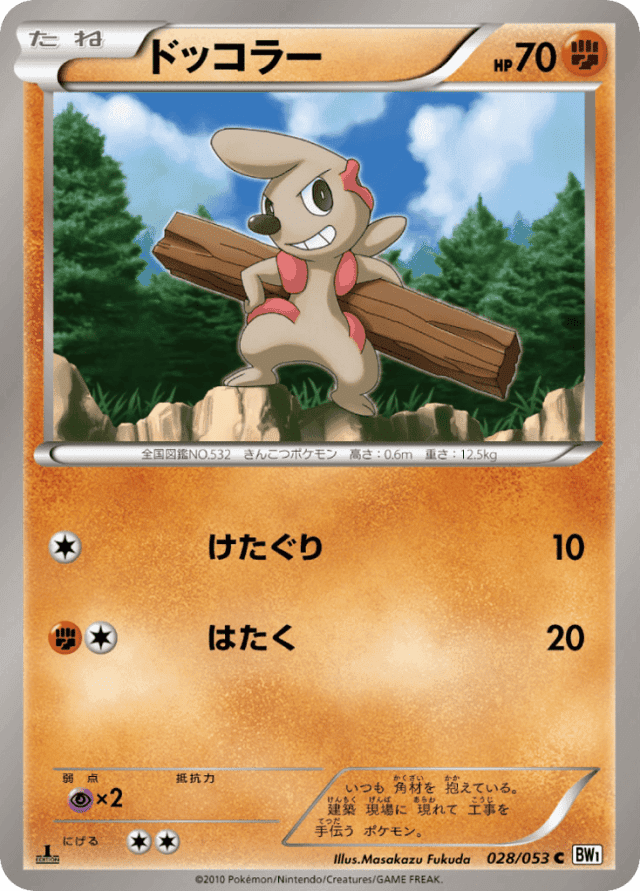 いつも 角材を 抱えている。 建築 現場に 現れて 工事を 手伝う ポケモン。