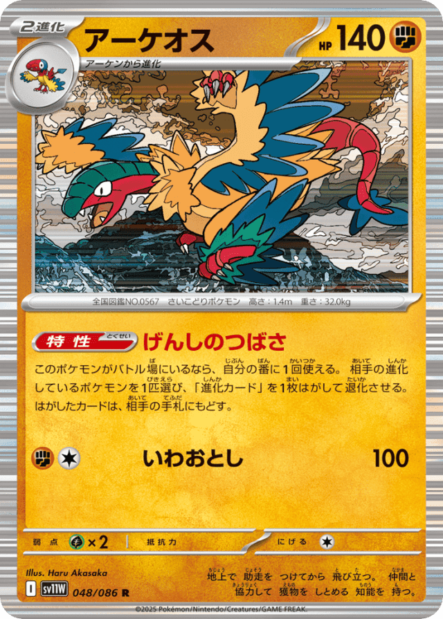 Primal Wingsこのポケモンがバトル場にいるなら、自分の番に1回使える。相手の進化しているポケモンを1匹選び、「進化カード」を1枚はがして退化させる。はがしたカードは、相手の手札にもどす。