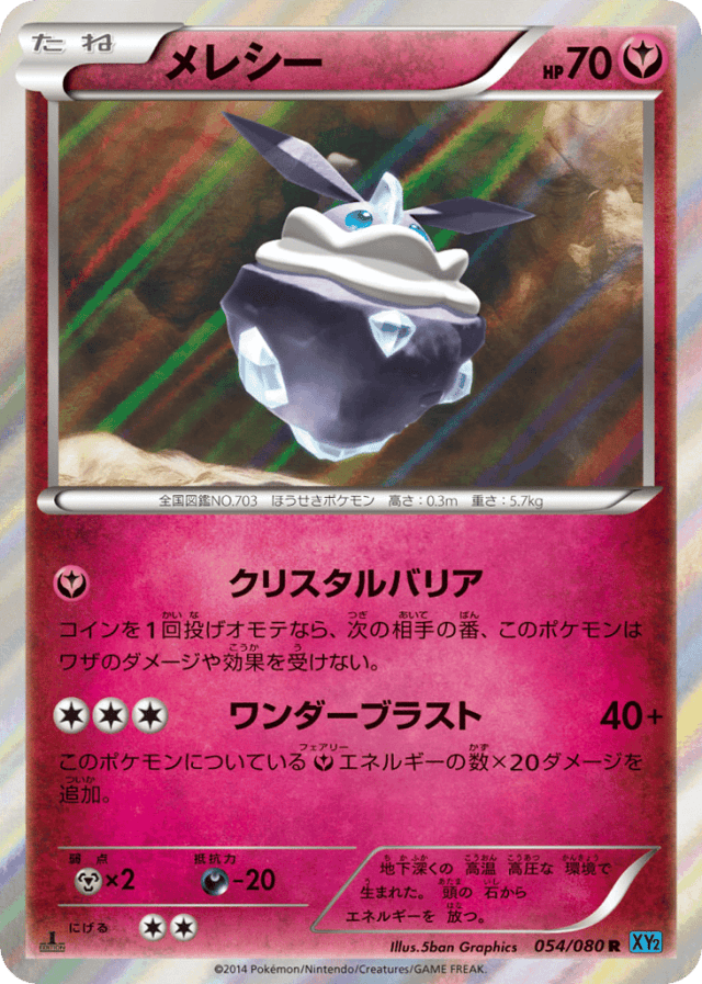 Crystal BarrierCost: 1コインを1回投げオモテなら、次の相手の番、このポケモンはワザのダメージや効果を受けない。