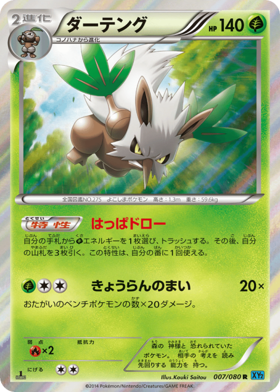 自分の手札からGrassエネルギーを1枚選び、トラッシュする。その後、自分の山札を3枚引く。この特性は、自分の番に1回使える。