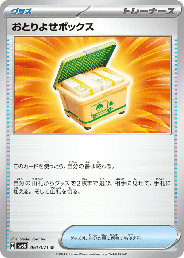 このカードを使ったら、自分の番は終わる。 自分の山札からグッズを2枚まで選び、相手に見せて、手札に加える。そして山札を切る。 グッズは、自分の番に何枚でも使える。