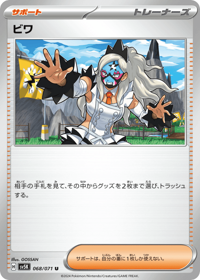 相手の手札を見て、その中からグッズを2枚まで選び、トラッシュする。 サポートは、自分の番に1枚しか使えない。