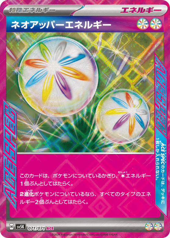 このカードは、ポケモンについているかぎり、Colorlessエネルギー1個ぶんとしてはたらく。 2進化ポケモンについているなら、すべてのタイプのエネルギー2個ぶんとしてはたらく。