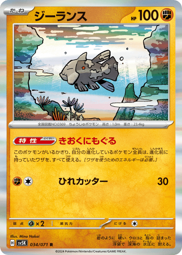 Memory Diveこのポケモンがいるかぎり、自分の進化しているポケモン全員は、進化前に持っていたワザを、すべて使える。[ワザを使うためのエネルギーは必要。]