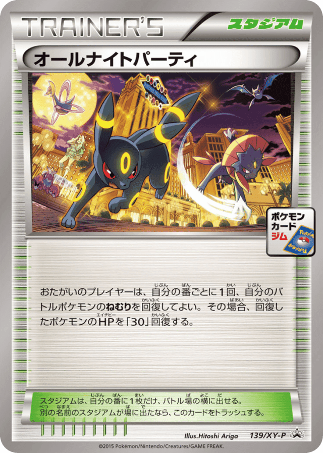おたがいのプレイヤーは、自分の番ごとに1回、自分のバトルポケモンのねむりを回復してよい。その場合、回復したポケモンのHPを「30」回復する。 スタジアムは、自分の番に1枚だけ、バトル場の横に出せる。別の名前のスタジアムが場に出たなら、このカードをトラッシュする。