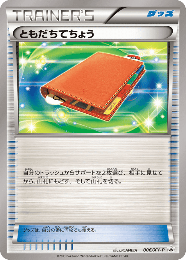 自分のトラッシュからサポートを2枚選び、相手に見せてから、山札にもどす。そして山札を切る。 グッズは、自分の番に何枚でも使える。