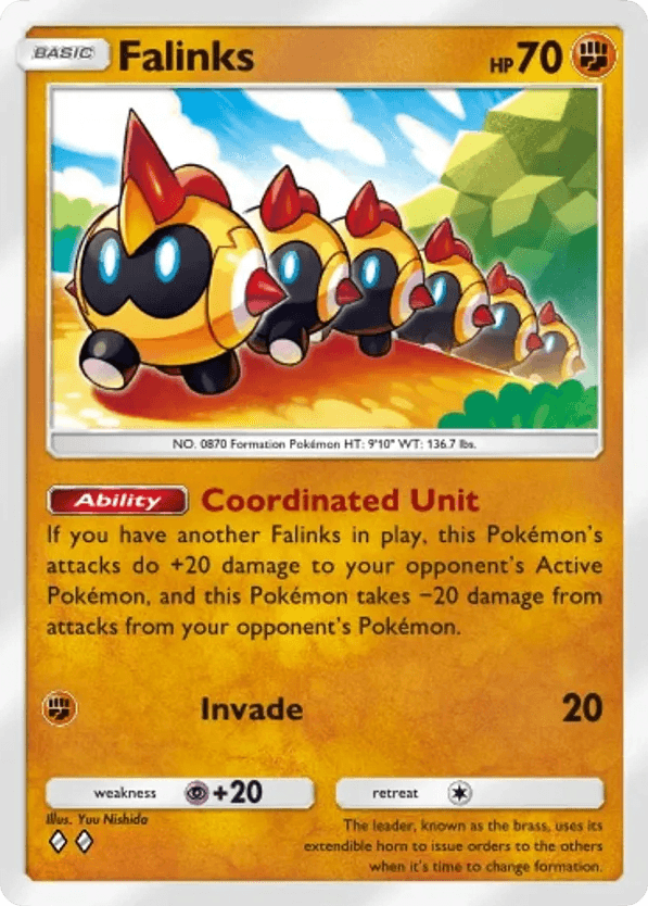 If you have another Falinks in play, this Pokémon's attacks do +20 damage to your opponent's Active Pokémon, and this Pokémon takes −20 damage from attacks from your opponent's Pokémon.