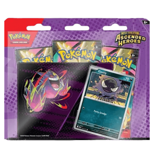 This sealed Pokémon Trading Card Game collection product is the Ascended Heroes Tech Sticker Collection — Gastly, a Collection from the Mega Evolution series. It includes a foil promo Gastly and a themed sheet of tech stickers depicting Gastly and Mega Gengar, along with included booster packs tied to the Ascended Heroes expansion. The item is part of Ascended Heroes (code ASC), an English-language Mega Evolution expansion of 295 cards released 2026-01-30 with a printed total of 217 cards. Buyers and collectors can expect a sealed collection-format product intended for play, display, or addition to existing sets, containing the promo card, sticker sheet, and expansion boosters consistent with this Tech Sticker Collection.