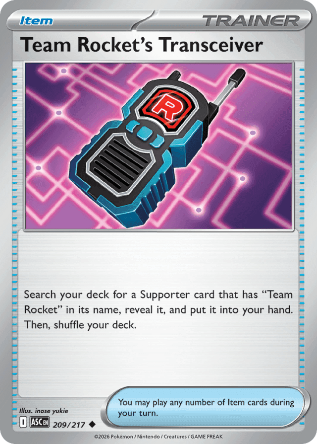 Search your deck for a Supporter card that has "Team Rocket" in its name, reveal it, and put it into your hand. Then, shuffle your deck. You may play any number of Item cards during your turn.