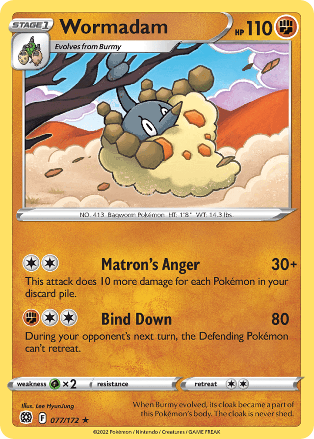 When Burmy evolved, its cloak became a part of this Pokémon's body. The cloak is never shed.
