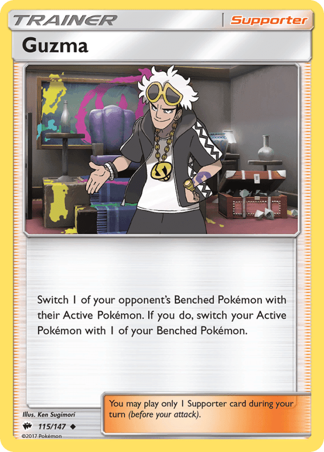 Switch 1 of your opponent's Benched Pokémon with their Active Pokémon. If you do, switch your Active Pokémon with 1 of your Benched Pokémon. You may play only 1 Supporter card during your turn (before your attack).
