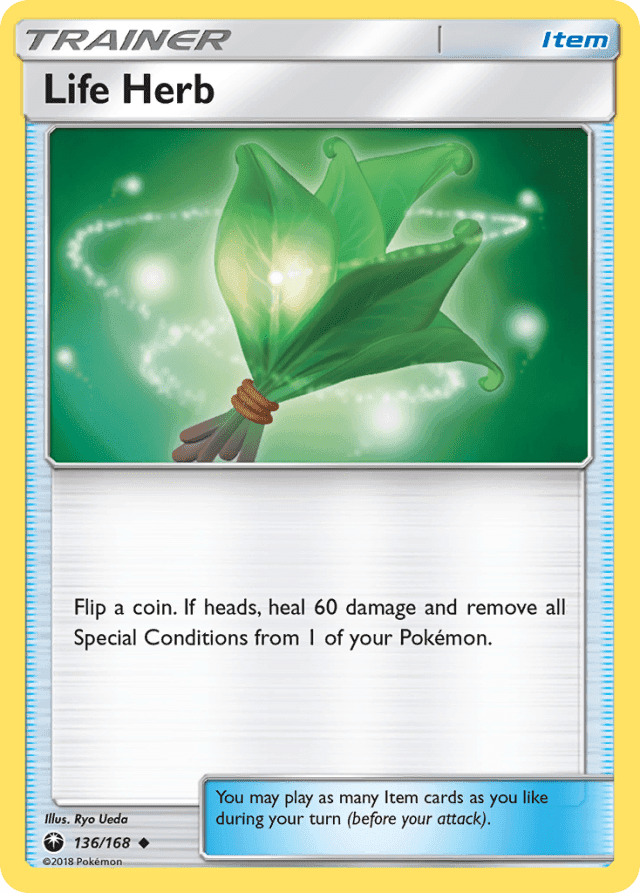 Flip a coin. If heads, heal 60 damage and remove all Special Conditions from 1 of your Pokémon. You may play as many Item cards as you like during your turn (before your attack).