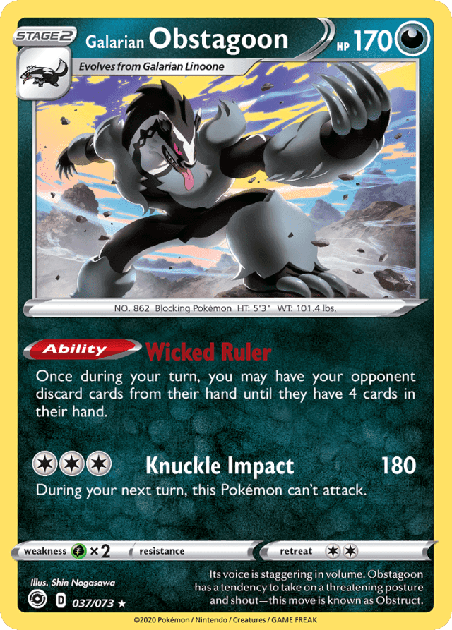 Its voice is staggering in volume. Obstagoon has a tendency to take on a threatening posture and shout—this move is known as Obstruct.