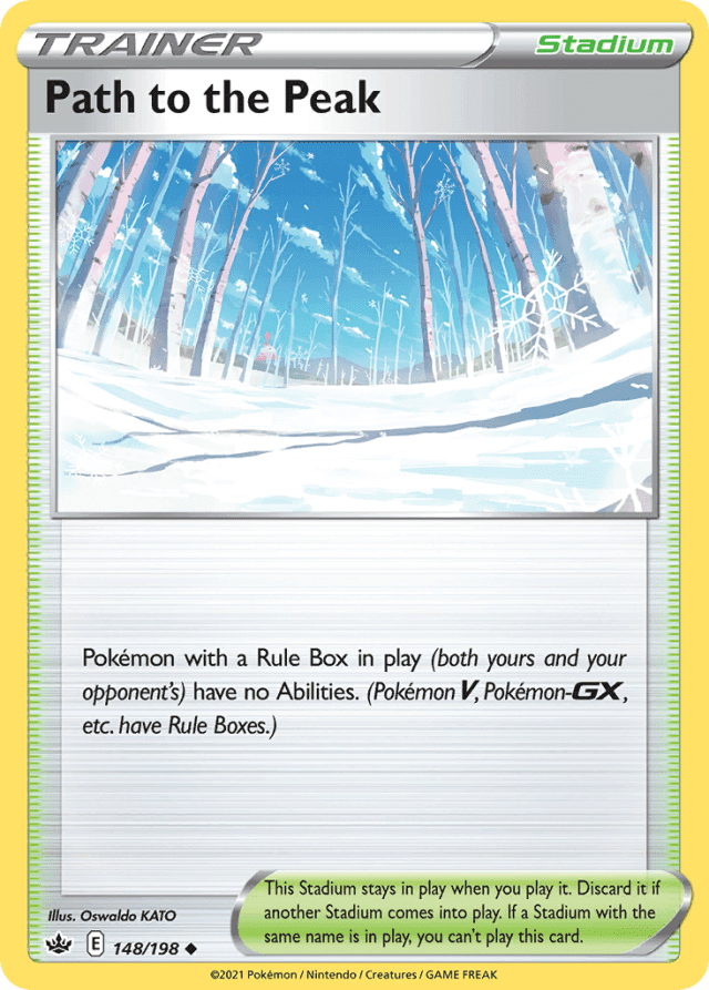Pokémon with a Rule Box in play (both yours and your opponent's) have no Abilities. (Pokémon V, Pokémon-GX, etc. have Rule Boxes.) This Stadium stays in play when you play it. Discard it if another Stadium comes into play. If a Stadium with the same name is in play, you can't play this card.