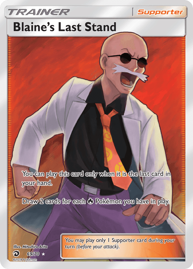 You can play this card only when it is the last card in your hand. Draw 2 cards for each Fire Pokémon you have in play. You may play only 1 Supporter card during your turn (before your attack).