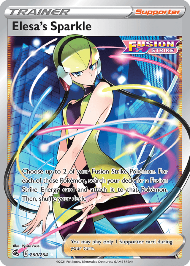 Choose up to 2 of your Fusion Strike Pokémon. For each of those Pokémon, search your deck for a Fusion Strike Energy card and attach it to that Pokémon. Then, shuffle your deck. You may play only 1 Supporter card during your turn.