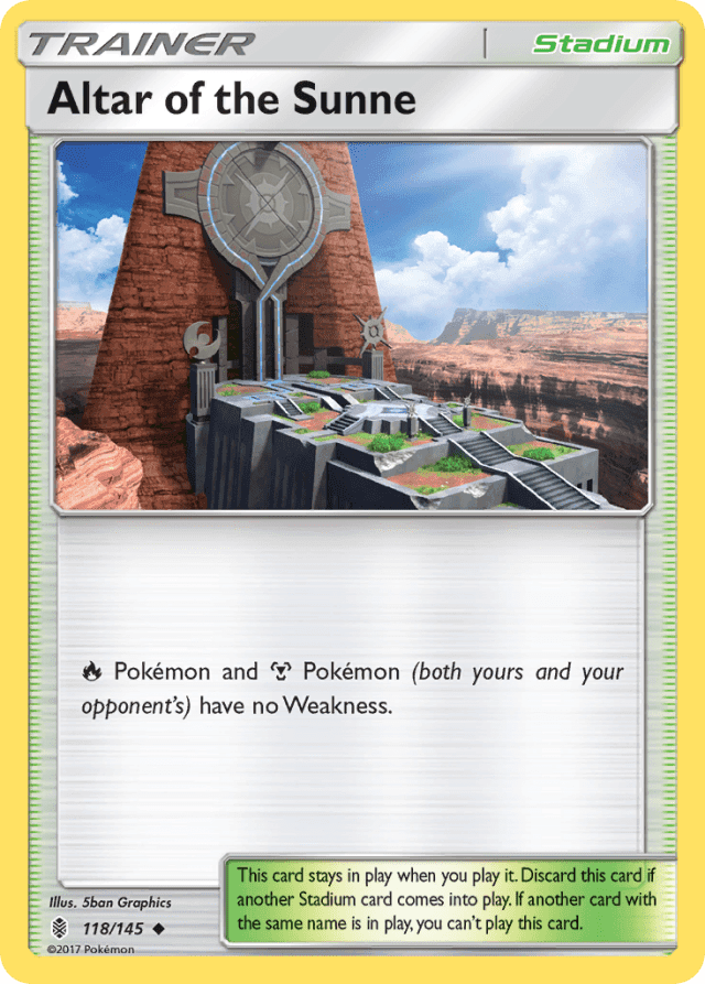 Fire Pokémon and Metal Pokémon (both yours and your opponent's) have no Weakness. This card stays in play when you play it. Discard this card if another Stadium card comes into play. If another card with the same name is in play, you can't play this card.