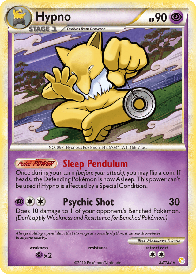 Once during your turn (before your attack), you may flip a coin. If heads, the Defending Pokémon is now Asleep. This power can't be used if Hypno is affected by a Special Condition.