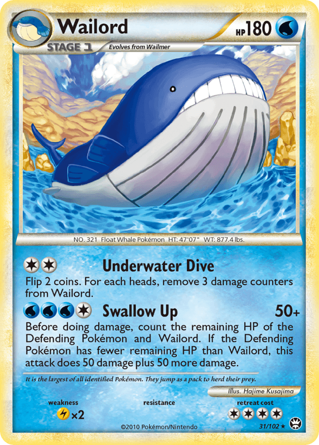 Before doing damage, count the remaining HP of the Defending Pokémon and Wailord. If the Defending Pokémon has fewer remaining HP than Wailord, this attack does 50 damage plus 50 more damage.