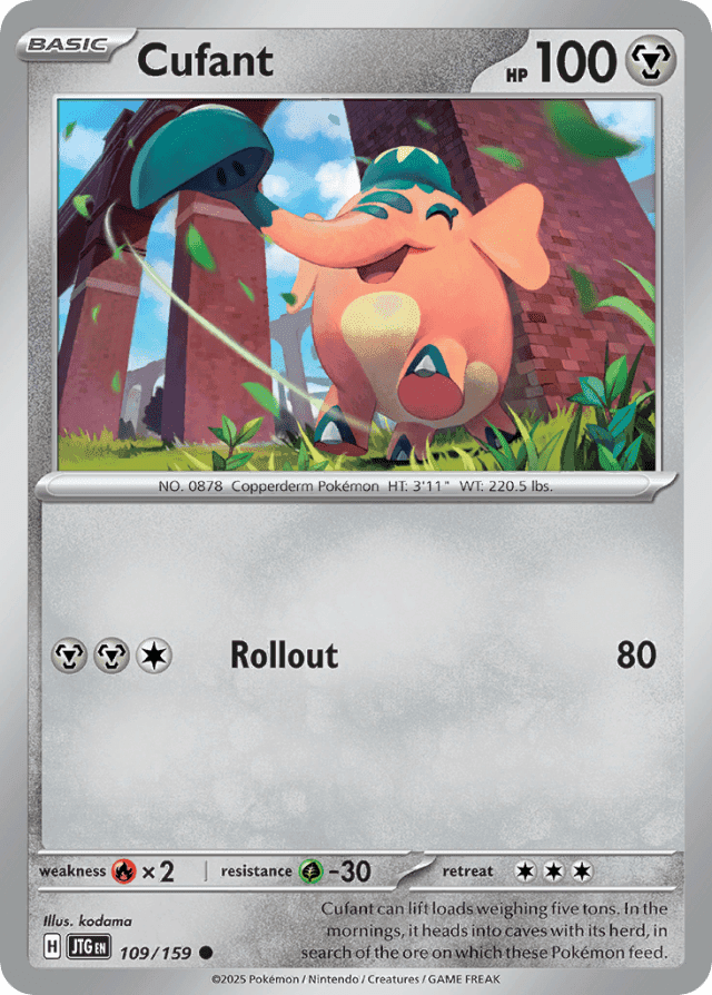 Cufant can lift loads weighing five tons. In the mornings, it heads into caves with its herd, in search of the ore on which these Pokémon feed.