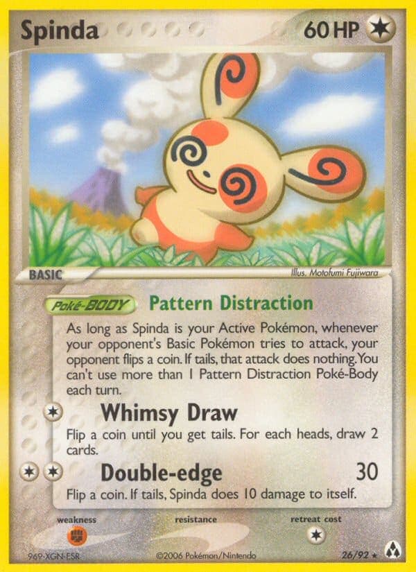 As long as Spinda is your Active Pokémon, whenever your opponent's Basic Pokémon tries to attack, your opponent flips a coin. If tails, that attack does nothing. You can't use more than 1 Pattern Distraction Poké-Body each turn.