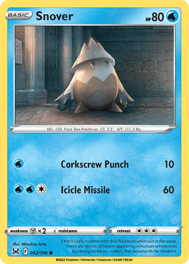 One is likely to encounter this Pokémon while out in the snow. There are stories of Snover appearing in human settlements but doing no harm—rather, they bond with the children.