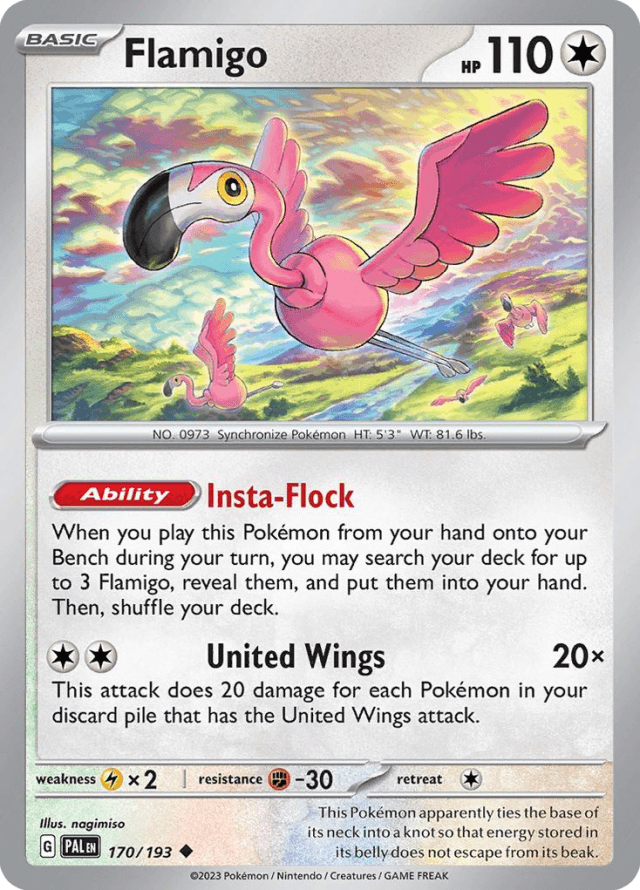 When you play this Pokémon from your hand onto your Bench during your turn, you may search your deck for up to 3 Flamigo, reveal them, and put them into your hand. Then, shuffle your deck.
