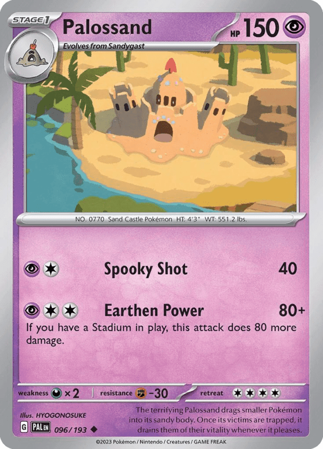 The terrifying Palossand drags smaller Pokémon into its sandy body. Once its victims are trapped, it drains them of their vitality whenever it pleases.