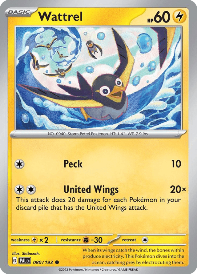 When its wings catch the wind, the bones within produce electricity. This Pokémon dives into the ocean, catching prey by electrocuting them.