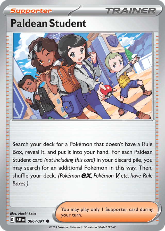 Search your deck for a Pokémon that doesn't have a Rule Box, reveal it, and put it into your hand. For each Paldean Student card (not including this card) in your discard pile, you may search for an additional Pokémon in this way. Then, shuffle your deck. (Pokémon ex, Pokémon V, etc. have Rule Boxes.) You may play only 1 Supporter card during your turn.