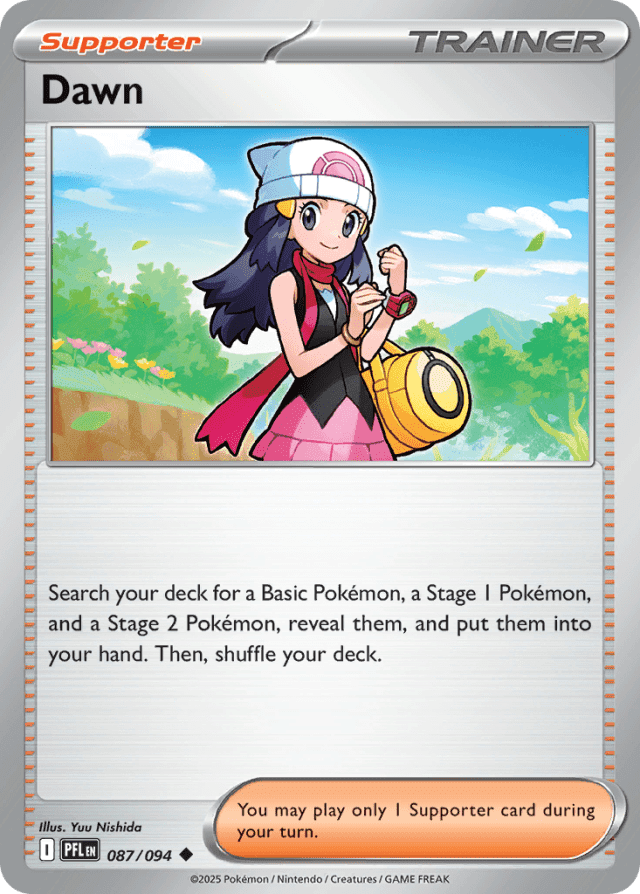 Search your deck for a Basic Pokémon, a Stage 1 Pokémon, and a Stage 2 Pokémon, reveal them, and put them into your hand. Then, shuffle your deck. You may play only 1 Supporter card during your turn.