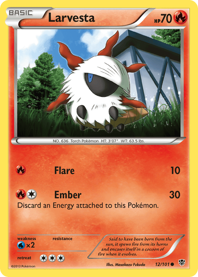 Said to have been born from the sun, it spews fire from its horns and encases itself in a cocoon of fire when it evolves.