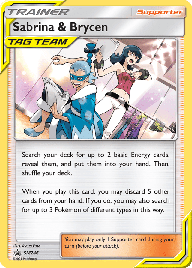 Search your deck for up to 2 basic Energy cards, reveal them, and put them into your hand. Then, shuffle your deck. When you play this card, you may discard 5 other cards from your hand. If you do, you may also search for up to 3 Pokémon of different types in this way. You may play only 1 Supporter card during your turn (before your attack).