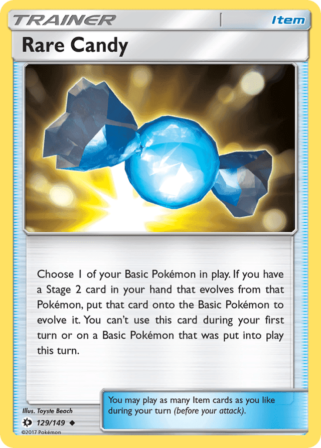 Choose 1 of your Basic Pokémon in play. If you have a Stage 2 card in your hand that evolves from that Pokémon, put that card onto the Basic Pokémon to evolve it. You can't use this card during your first turn or on a Basic Pokémon that was put into play this turn. You may play as many Item cards as you like during your turn (before your attack).