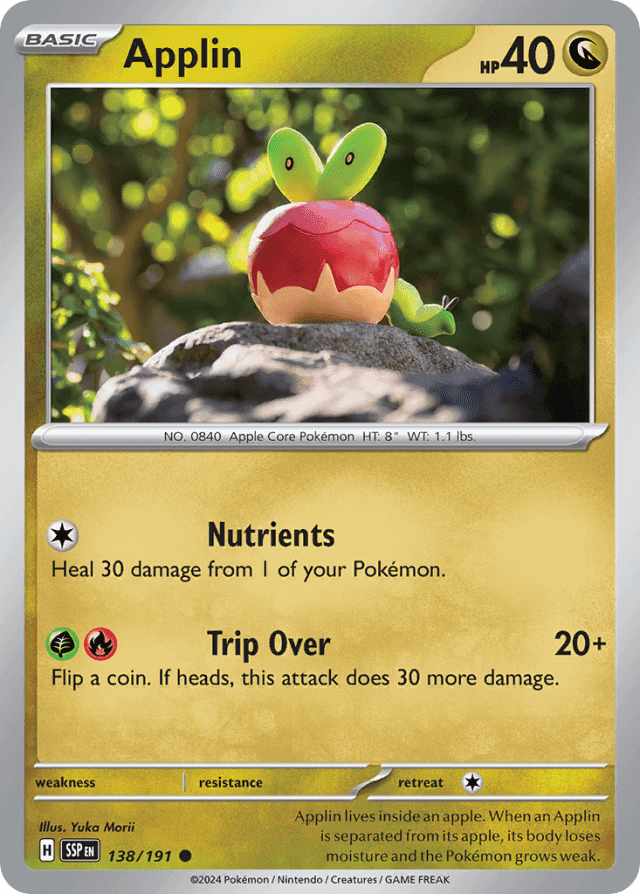 Applin lives inside an apple. When an Applin is separated from its apple, its body loses moisture and the Pokémon grows weak.