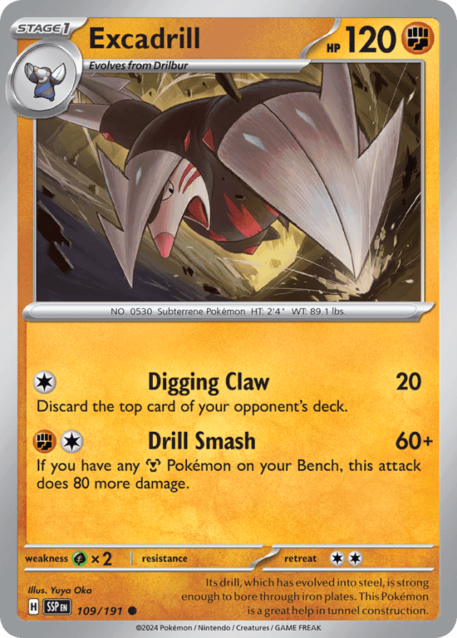 Its drill, which has evolved into steel, is strong enough to bore through iron plates. This Pokémon is a great help in tunnel construction.