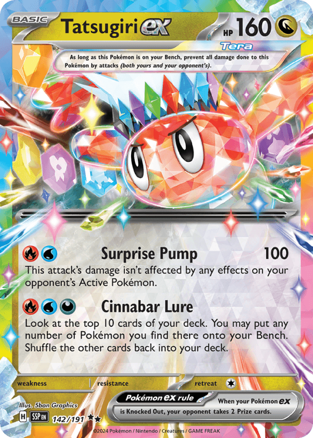 Pokémon ex rule: When your Pokémon ex is Knocked Out, your opponent takes 2 Prize cards. Tera: As long as this Pokémon is on your Bench, prevent all damage done to this Pokémon by attacks (both yours and your opponent's).