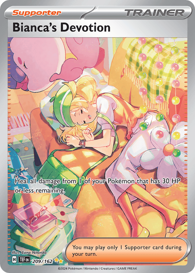 Heal all damage from 1 of your Pokémon that has 30 HP or less remaining. You may play only 1 Supporter card during your turn.
