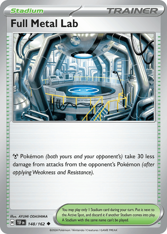 Metal Pokémon (both yours and your opponent's) take 30 less damage from attacks from the opponent's Pokémon (after applying Weakness and Resistance). You may play only 1 Stadium card during your turn. Put it into the Active Spot, and discard it if another Stadium comes into play. A Stadium with the same name can't be played.