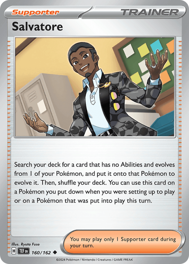 Search your deck for a card that has no Abilities and evolves from 1 of your Pokémon, and put it onto that Pokémon to evolve it. Then, shuffle your deck. You can use this card on a Pokémon you put down when you were setting up to play or on a Pokémon that was put into play this turn. You may play only 1 Supporter card during your turn.