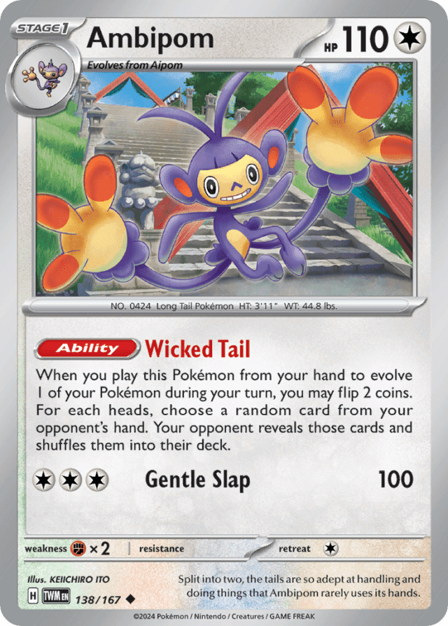 When you play this Pokémon from your hand to evolve 1 of your Pokémon during your turn, you may flip 2 coins. For each heads, choose a random card from your opponent's hand. Your opponent reveals those cards and shuffles them into their deck.