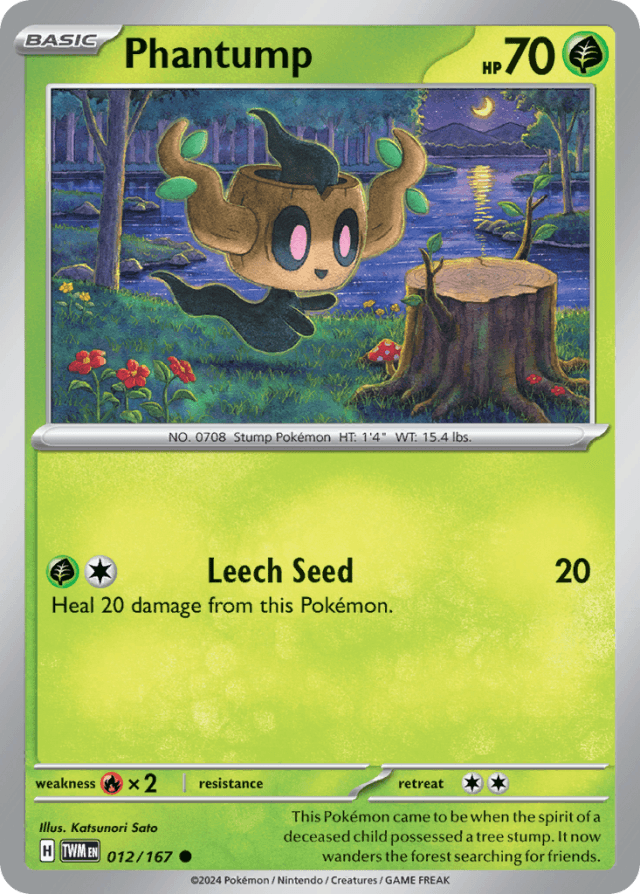 This Pokémon came to be when the spirit of a deceased child possessed a tree stump. It now wanders the forest searching for friends.