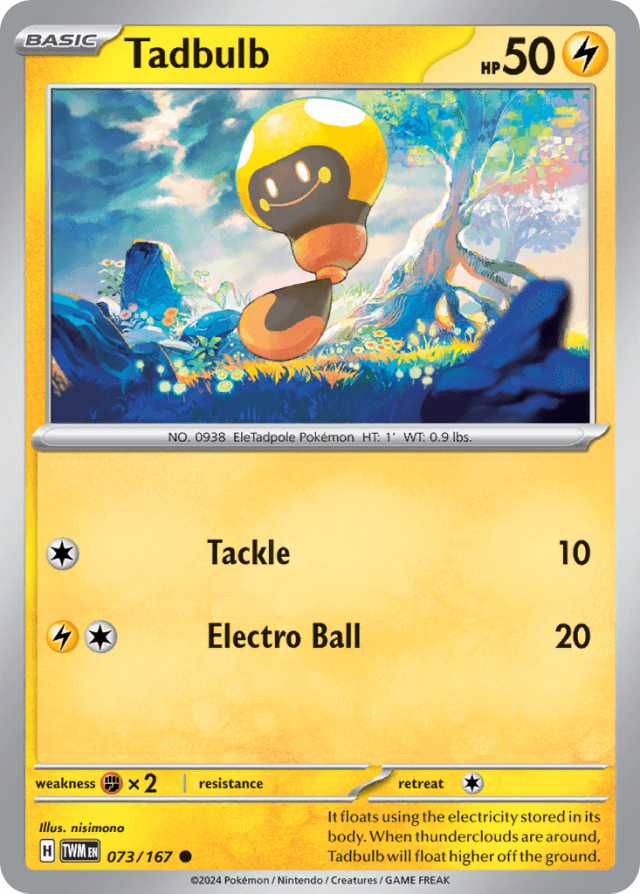 It floats using the electricity stored in its body. When thunderclouds are around, Tadbulb will float higher off the ground.