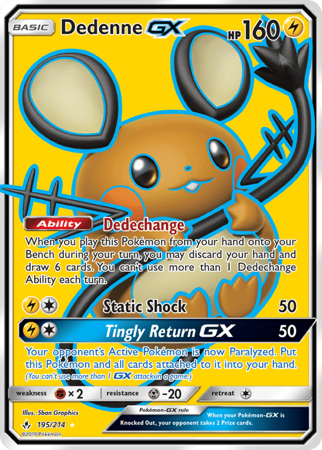 When you play this Pokémon from your hand onto your Bench during your turn, you may discard your hand and draw 6 cards. You can't use more than 1 Dedechange Ability each turn.