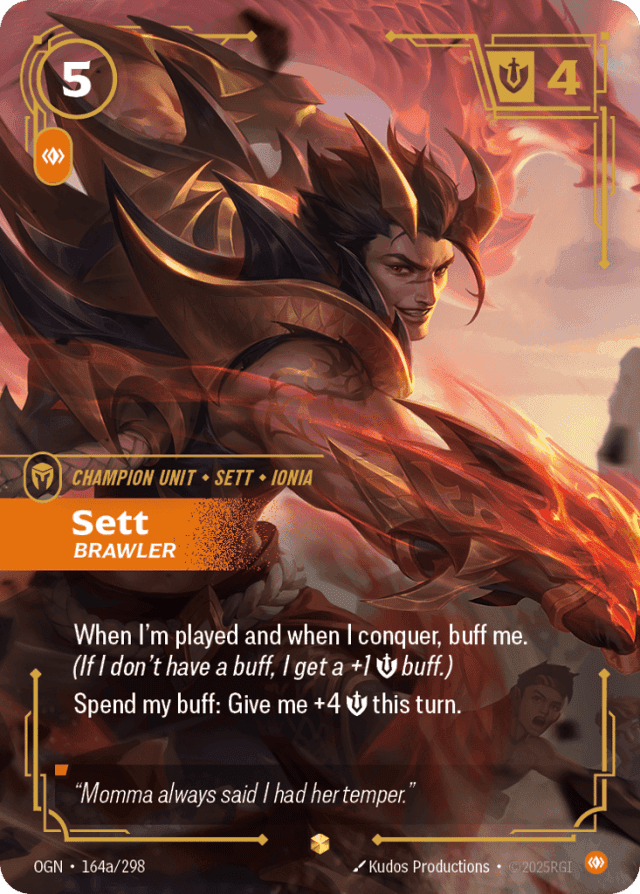 When I'm played and when I conquer, buff me. (If I don't have a buff, I get a +1 {M} buff.) Spend my buff: Give me +4 {M} this turn.