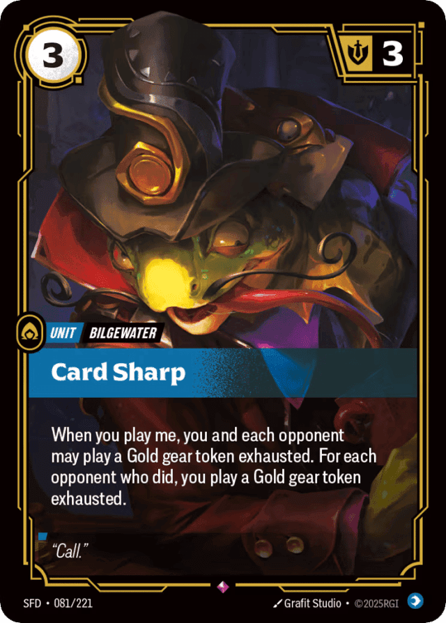 When you play me, you and each opponent may play a Gold gear token exhausted. For each opponent who did, you play a Gold gear token exhausted.