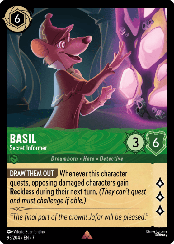 Whenever this character quests, opposing damaged characters gain Reckless during their next turn. (They can't quest and must challenge if able.)