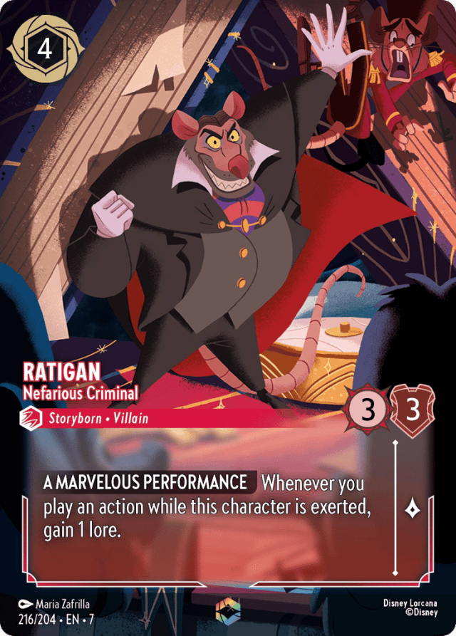Whenever you play an action while this character is exerted, gain 1 lore.