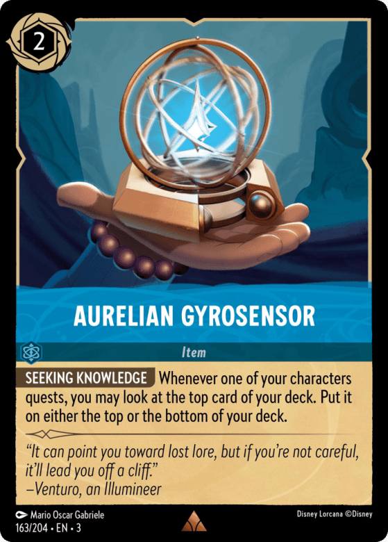 Whenever one of your characters quests, you may look at the top card of your deck. Put it on either the top or the bottom of your deck.